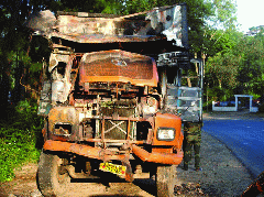 A truck bound for Shillong, victim of a petrol bomb attack during the road blockade